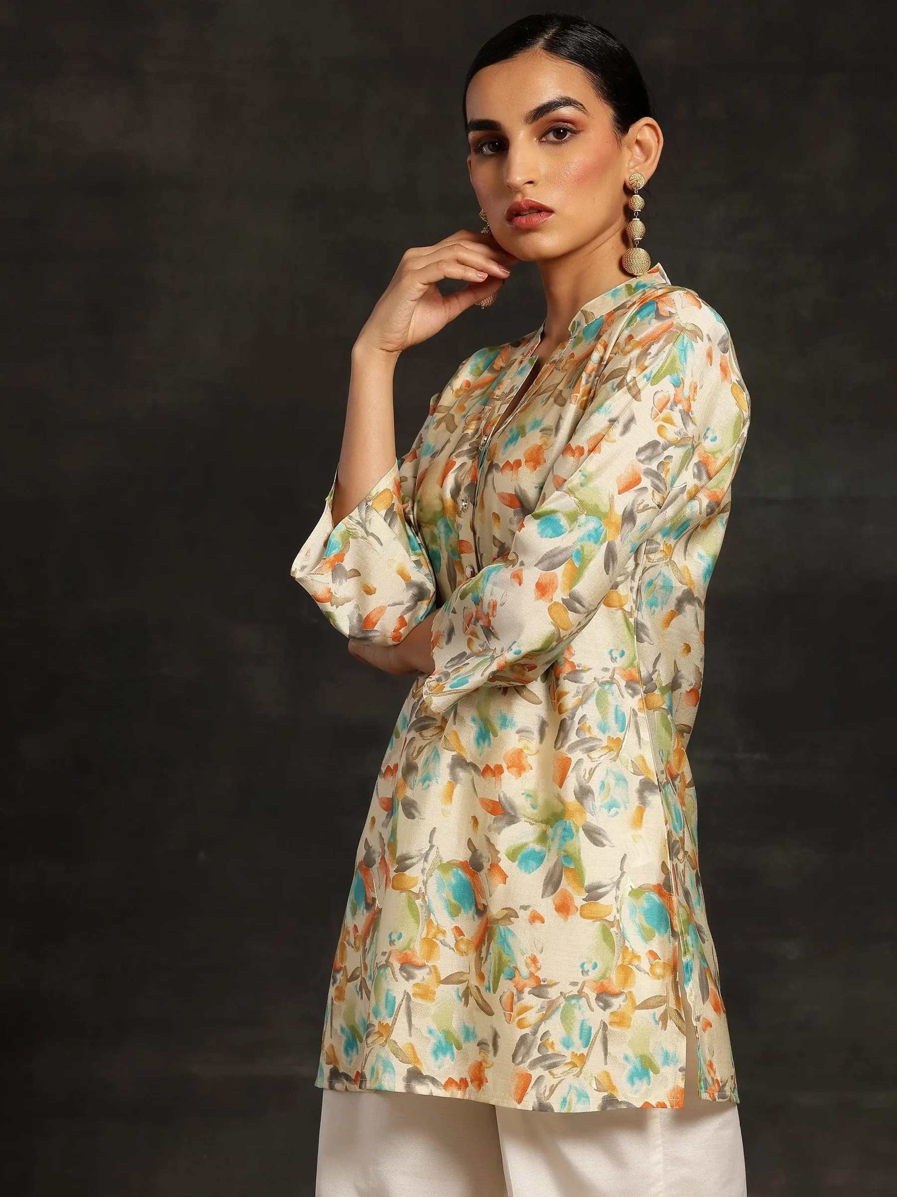 - Product Name: Beige Printed Silk Blend Straight Kurtis