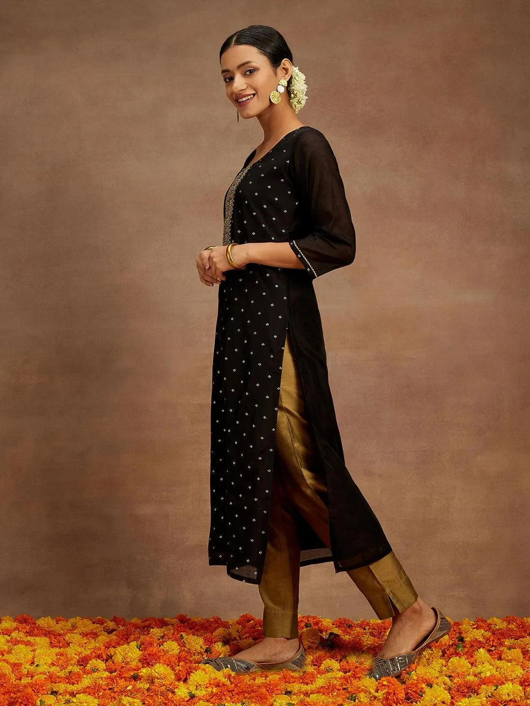 - Product Name: Black Woven Design Chanderi Silk Straight Kurta