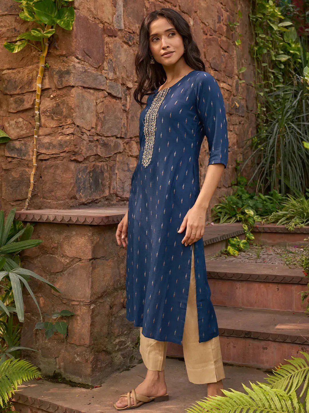 When you wear Blue Woven Design Cotton Straight Kurta, you carry a look that feels graceful, fashionable, and effortlessly elegant.