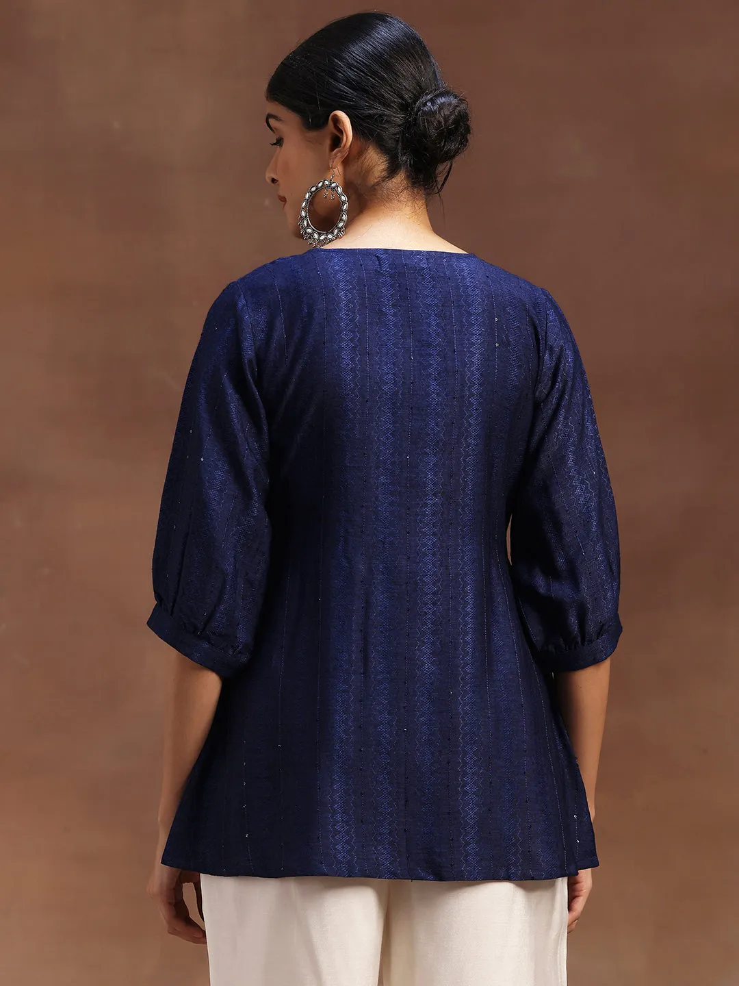 Note: The color of Blue Woven Design Silk Blend A-Line Kurti may slightly vary due to lighting, photography, or screen settings.