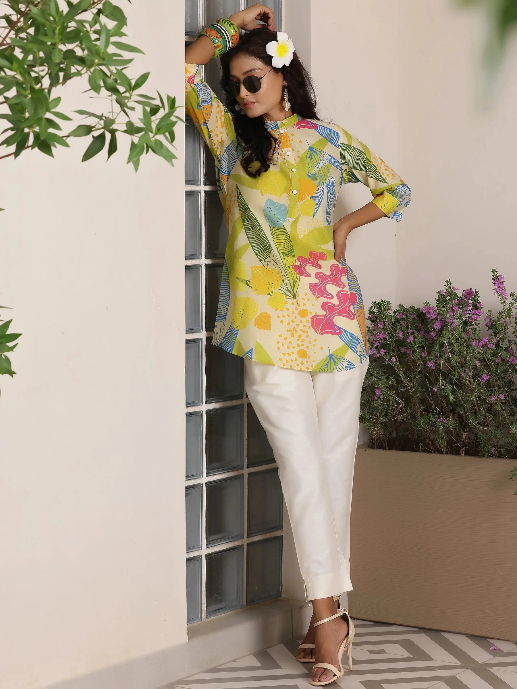 • Product Name: Cream Printed Silk Blend Straight Kurti