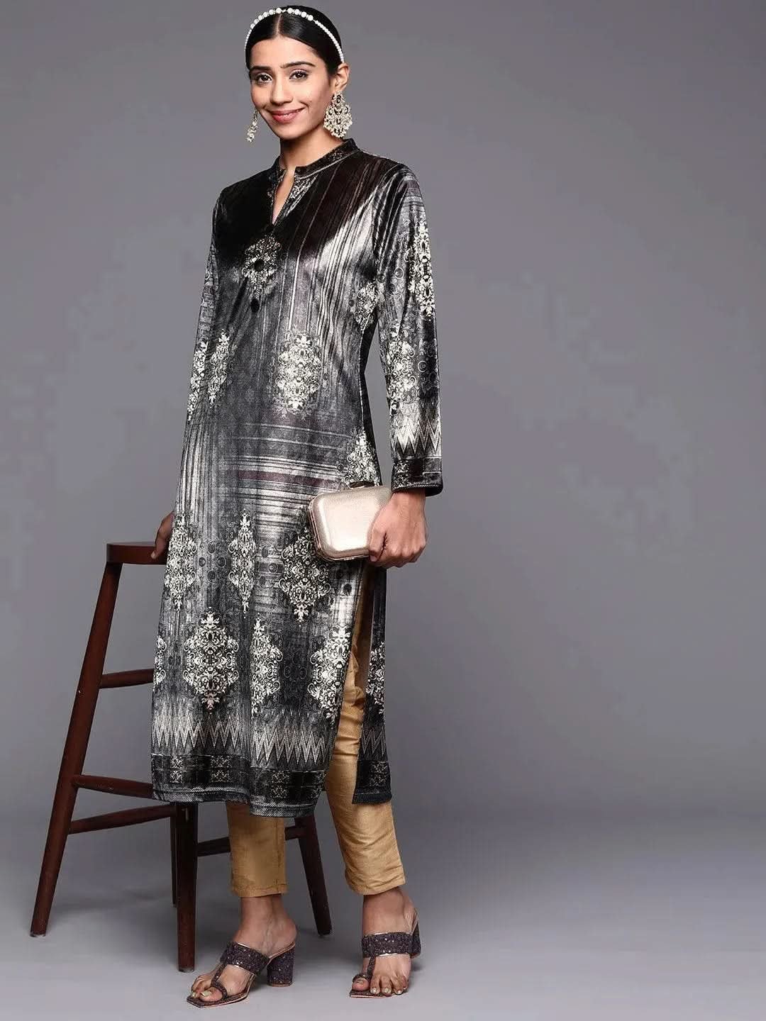 ✨ Key Features of Grey Printed Velvet Straight Kurta:
