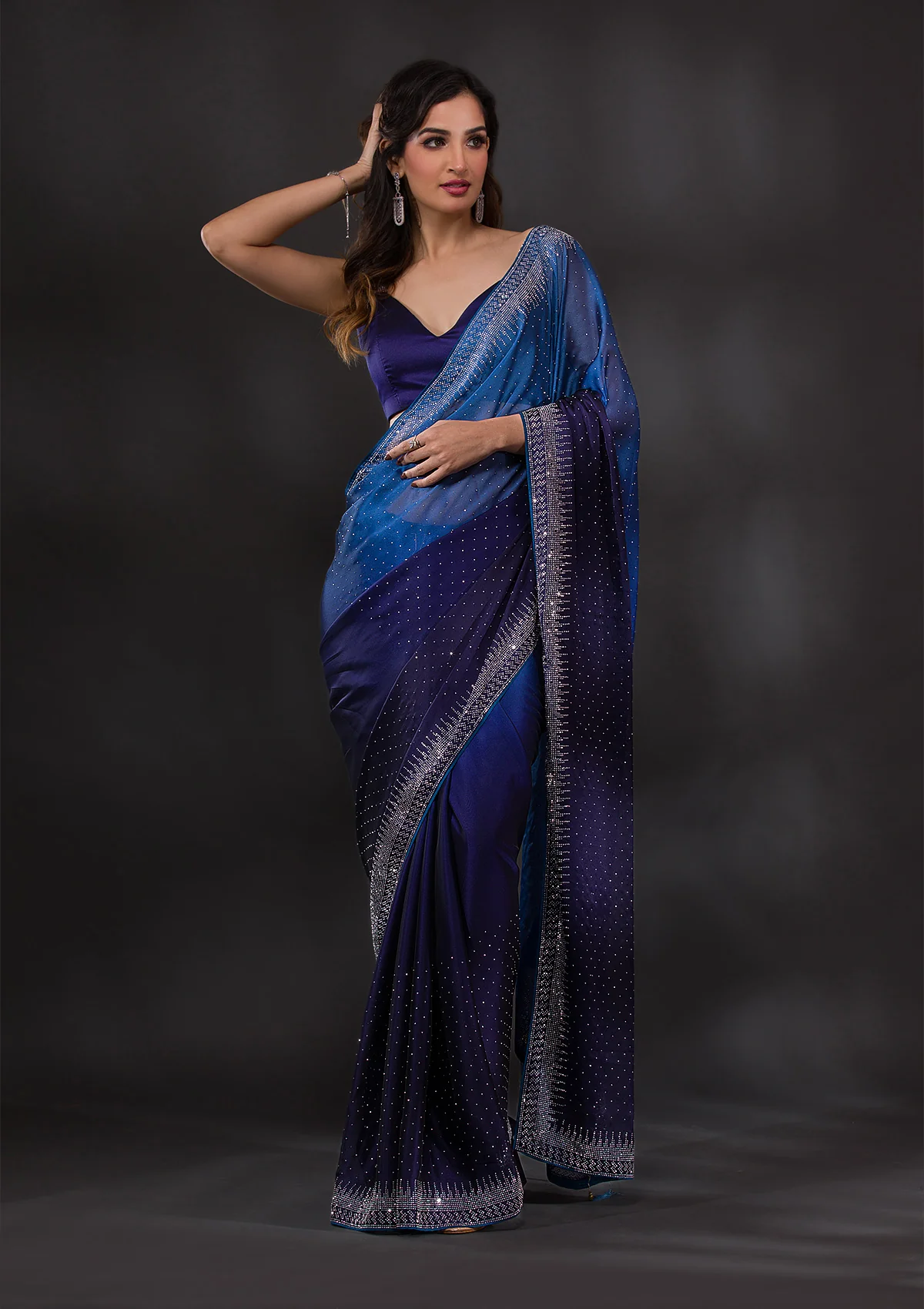 Ombre Navy Blue Stonework Satin Designer Saree is designed to enhance your natural beauty while offering maximum comfort.