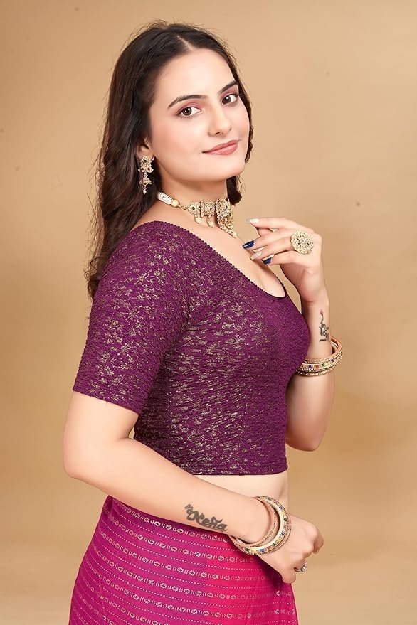 Note: The color of Round Neck Jacquard Elbow Sleeve Readymade Saree Blouse for Women Stylish may slightly vary due to lighting, photography, or screen settings.