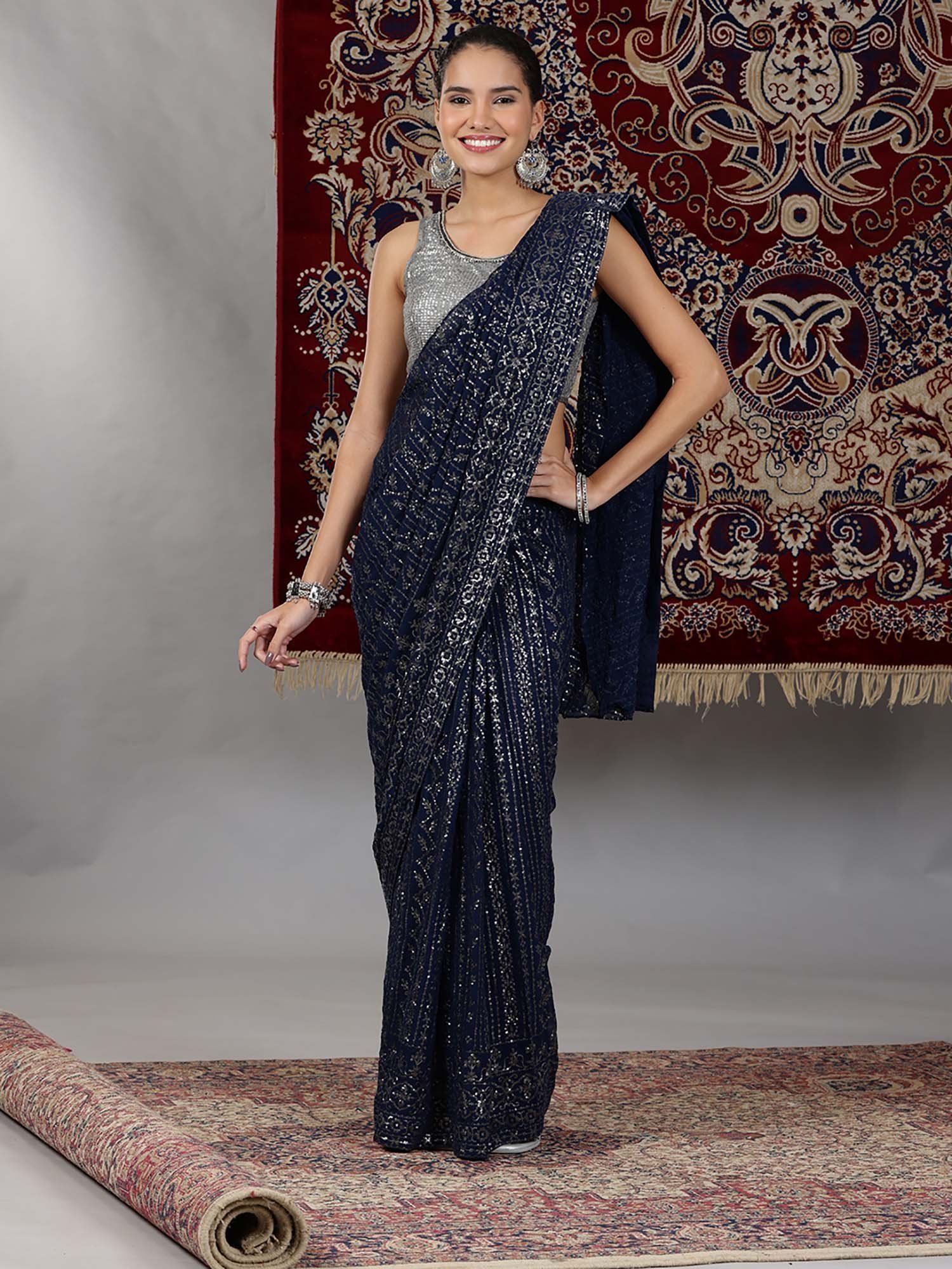 • Product Name: Silver and Blue Sequin Embellished Crop Top and Pre-Stitched Saree (Set of 2)